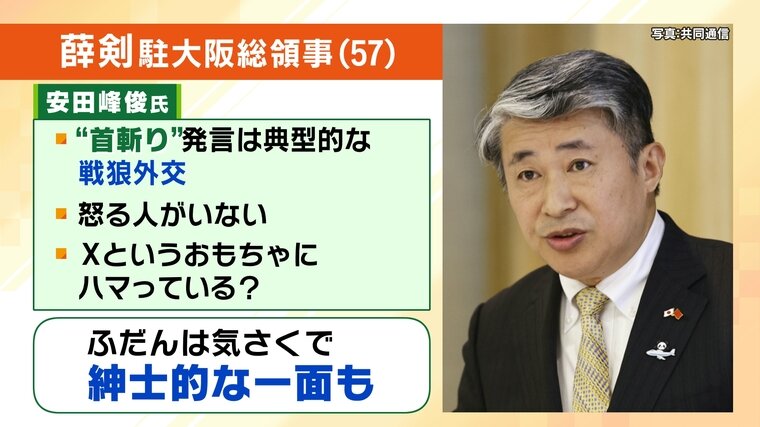 今回の薛剣氏の発言も「典型的な戦狼外交」で、大使と同クラスの地位とされる駐大阪総領事を叱る人もいないのでは?と安田氏は指摘。また、1日100件近く投稿するくらい、Xという“おもちゃ”にハマっていると思われる節もあるようです。