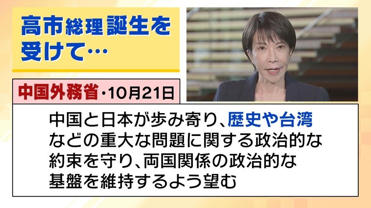 高市総理の誕生を受けて、中国外務省は10月21日の会見で、「中国と日本が歩み寄り、歴史や台湾などの重大な問題に対する政治的な約束を守り、両国関係の政治的な基盤を維持するよう望む」と発表。これは岸田氏・石破氏の総理就任時にはなかった出来事です。