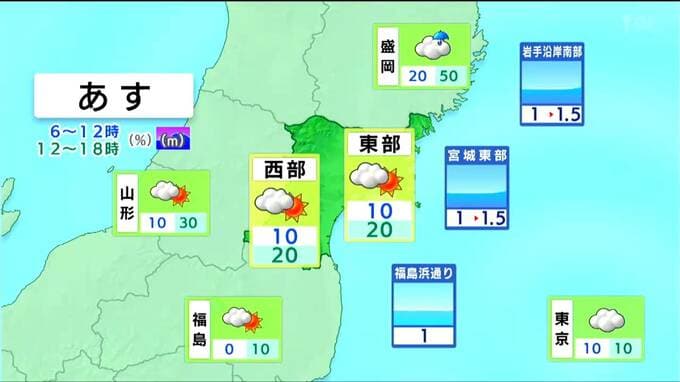 朝晩は晴れますが、日中は雲が多く、前線が通過する夕方以降は西部を中心に雨の降る所がありそうです。海上では南西の風がやや強く吹くでしょう。