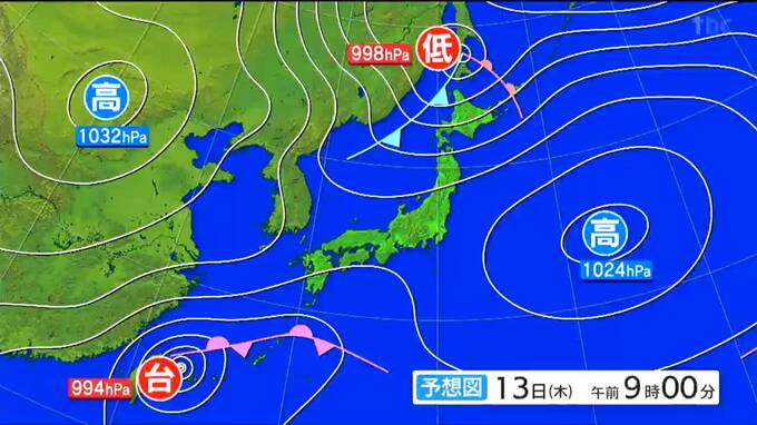 13日午前9時の予想天気図です。北海道の北を低気圧が東に進み、そこから伸びる寒冷前線が、午後に東北地方を通過するでしょう。前線に向かって暖かな空気が流れ込みそうです。