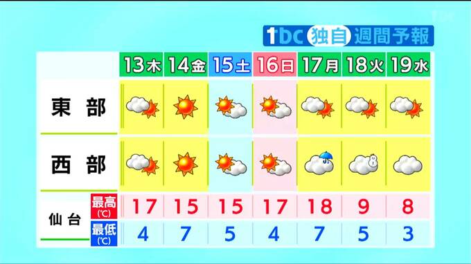 最高気温は、15℃から17℃と12日より2℃前後高く、平年よりもやや高くなりそです。