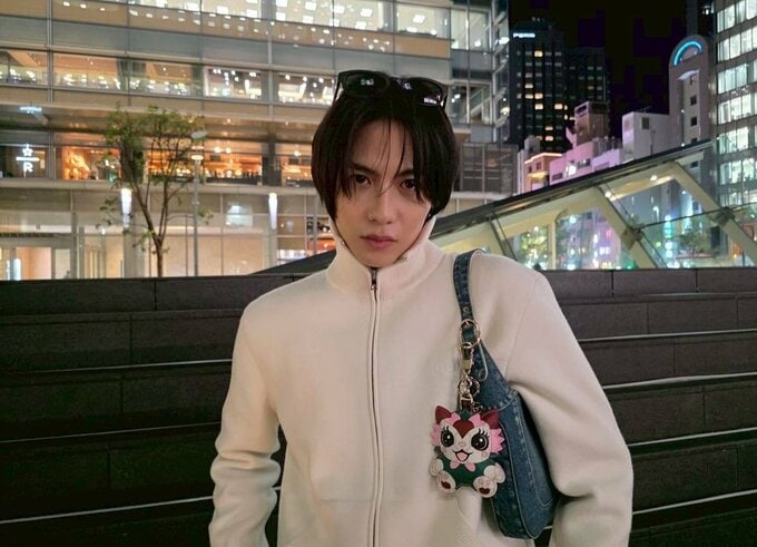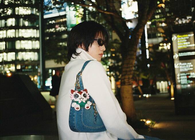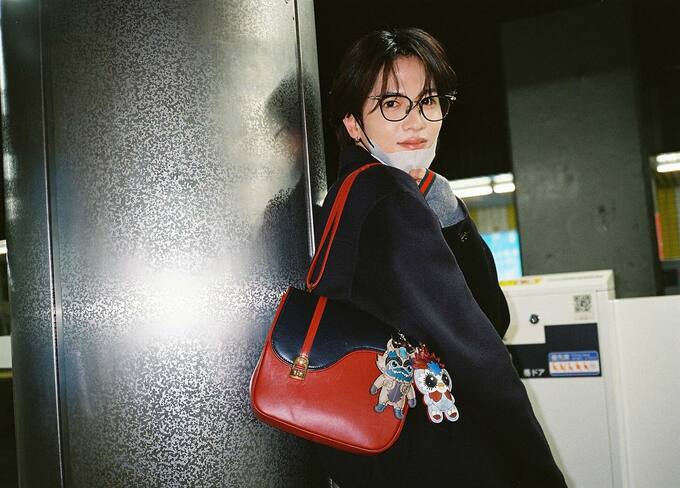 特に目を引くのは、志尊さんが愛用している赤と黒のショルダーバッグに取り付けられたカラフルなキャラクターのキーホルダーです。猫のようなモチーフのキーホルダーが、コーディネートのアクセントになっています。
