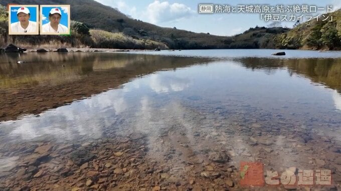 訪れたのは、伊豆スカイラインでも最も標高が高い玄岳(くろたけ)ICのすぐ近く。2人は、道の脇から荒れた道を下りて行きます。すると、車道の下をくぐるように造られた歩道が出現!その歩道を辿ると、火山の活動で生じた窪地に水がたまり、自然にできたという「氷ヶ池(こおりがいけ)」が姿を現します。