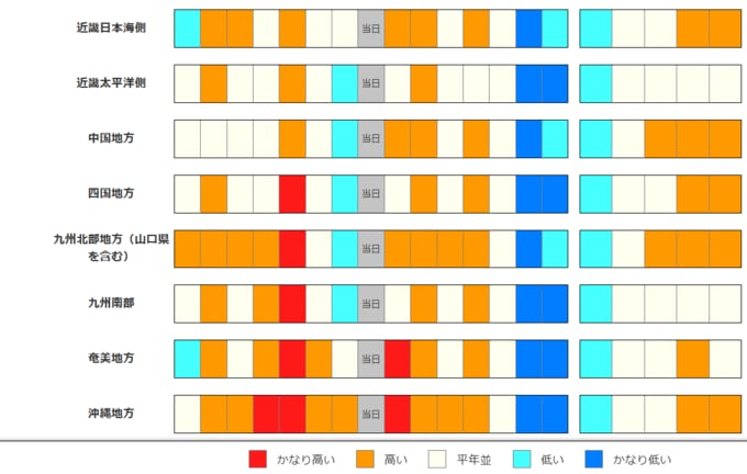 ・2週目の予報は中心の日に前後2日間を加えた5日間の平均(平均気温の5日間平均)です。平均期間は中心の日の下に表示しています。2週目のかなり高い(かなり低い)は、かなり高い(かなり低い)気温となる確率が30%以上のときに表示します。