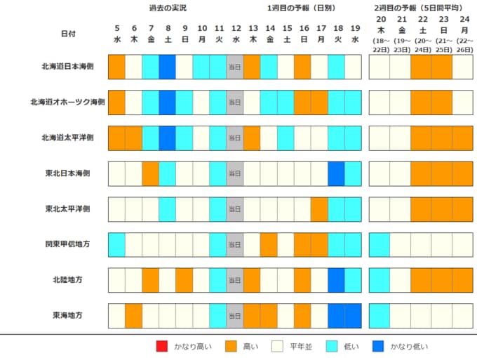 北海道地方の気温は、向こう1週間程度は平年並か低い日が多いですが、その後は平年並か高いでしょう。