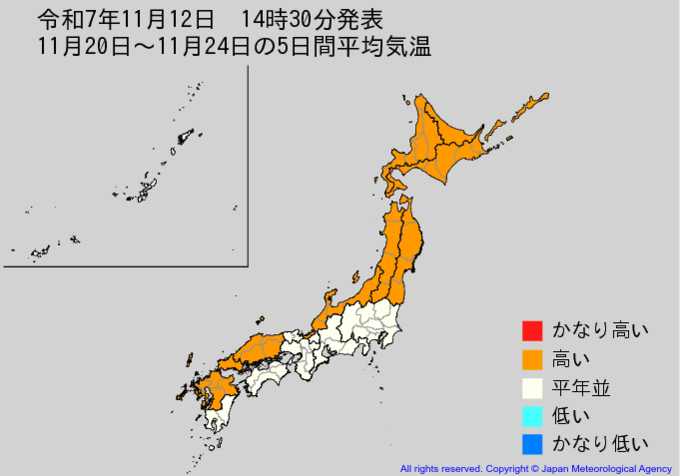 【2週間気温予報】東北地方の向こう2週間の気温は平年並か高い日が多い予報 18日から20日頃まではかなり低い日も 農作物の管理などに注意 全国の天気を地方ごとに 気象庁 テレビユー山形 2025年11月12日(水) 16:09 国内 ■11月20日~11月24日の5日間平均気温 ・8日先から12日先まで5日間平均した日平均気温を表示しています。 ・かなり高い(かなり低い)は、かなり高い(かなり低い)気温となる確率が30%以上のときに表示します。