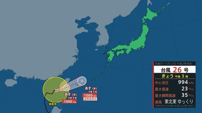 大型の台風26号は、きょう(12日)午後3時現在、バシー海峡をゆっくりの速さで東北東へ進んでいます。