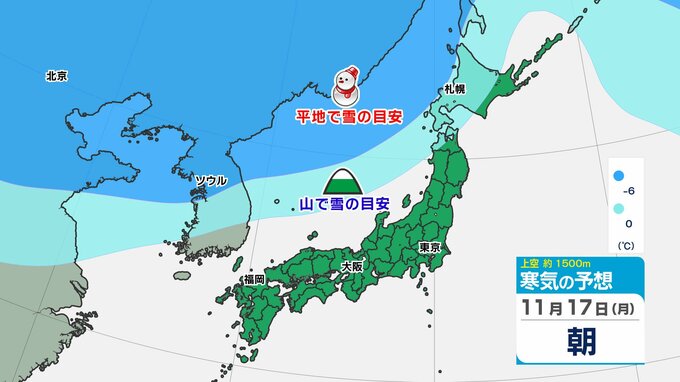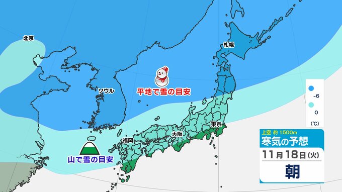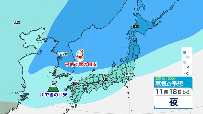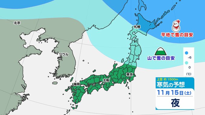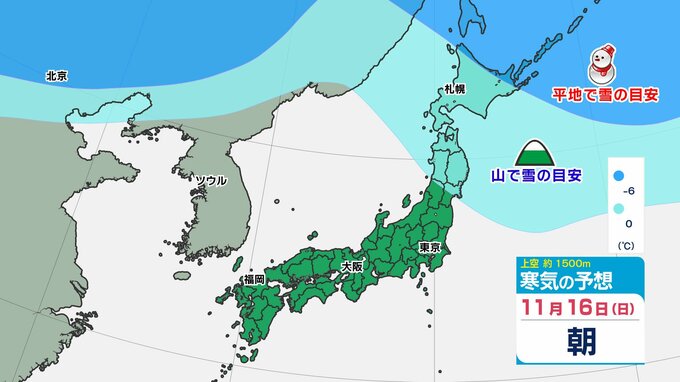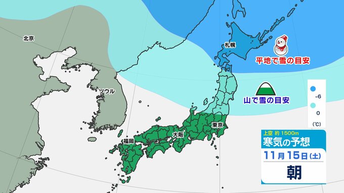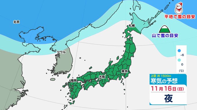 【爆弾低気圧】強い寒気が南下 本州も「初雪」ラッシュ 東京13℃ 大阪12℃予想 西日本でも「山沿いで積雪」【雪と雨・寒気のシミュレーション16日(日)~19日(水)】雪はいつから どこで? 南日本放送 2025年11月14日(金) 21:00 国内 天気 寒気のシミュレーション15日(日)~20日(木) 上空約1500mの寒気の予想です。18日(火)には、山で雪の目安〈0℃以下〉が九州までをすっぽり覆い、平地で雪の目安〈-6℃以下〉の寒気が北陸地方まで南下してきます。画像で確認できます。