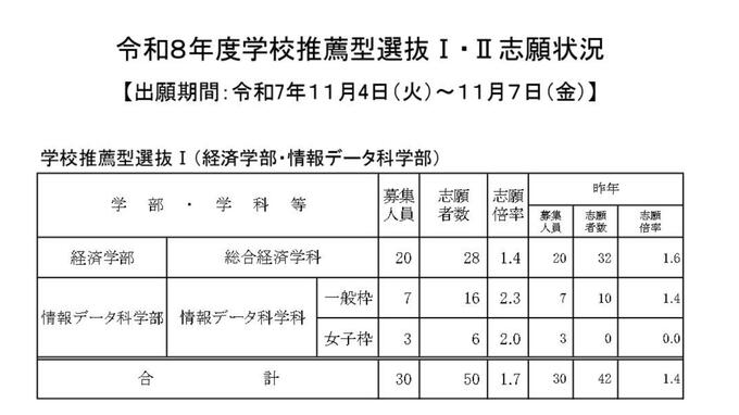 長崎大学は、2026年度学校推薦型選抜の志願状況を発表しました。教育学部で2.2倍、水産学科で2.9倍などとなっています。出願期間11月4日から7日まで。詳しくは画像で確認できます。