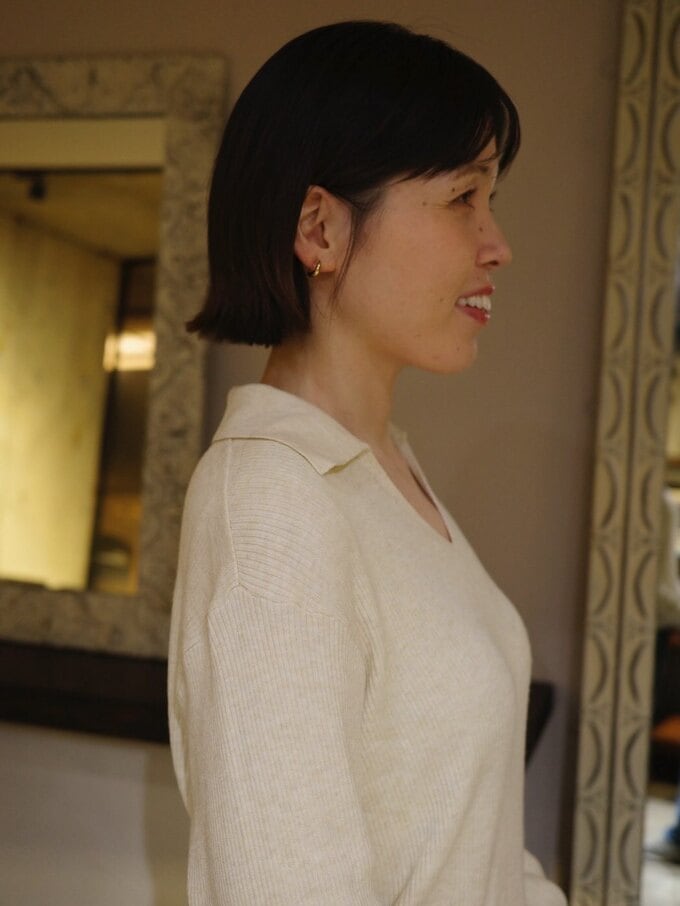 横向きの写真では、誠子さんが「冬の大人ボブ」と表現するヘアスタイルの短めのシルエットが際立って見えます。