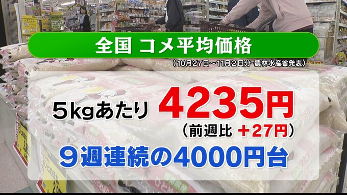 農林水産省によりますと、11月2日までの1週間に全国のスーパーで販売されたコメの平均価格は、5キロあたり4235円でした。前の週と比べて27円の値上がりで、これで9週連続の4000円台と、高値での推移が続いています。
