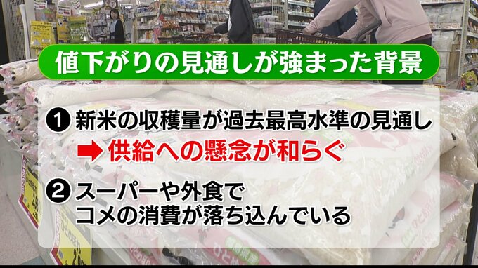 また、高値が続いていることから、スーパーや外食の現場でコメの消費が落ち込んでいることも、今後の価格を押し下げる要因だと分析されています。