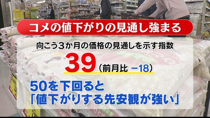 コメの卸売業者などで作る団体「米穀安定供給確保支援機構」は、全国の生産者や集荷業者などに対し、毎月コメ価格の見通しを調査しています。10日に発表された、10月調査分の「向こう3か月」の価格見通し指数は、前の月の調査分から18ポイント減少し「39」となりました。この指数は、50を下回ると「値下がりする先安観が強い」ことを示します。50を下回ったのは3か月ぶりで、今後、コメ価格が値下がりすると見る取引業者が多くなったことが分かります。
