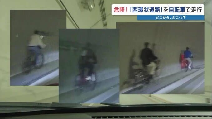 画面左に自転車が1台、2台・・・さらにその先に自転車が2台。西環状道路にあるトンネル内で、自転車4台が道路左側の避難通路を走る姿が確認されました。