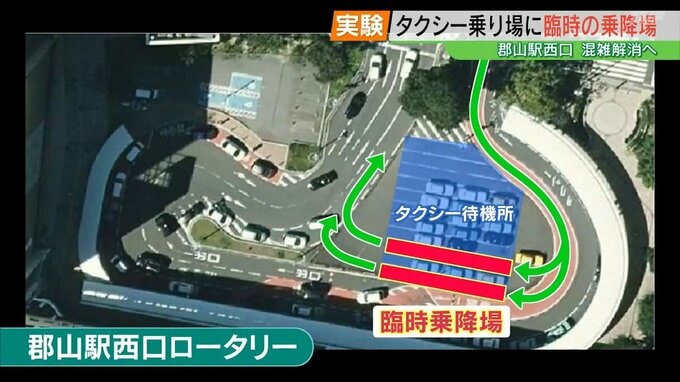 JR郡山駅前で始まったのは、駅前ロータリー周辺の渋滞解消に向けた交通社会実験です。駅西口のロータリーは、一般車両の停車場所が少ないため、これまで渋滞が発生していました。実験では、午後4時から午後9時までの間、駅西口にあるタクシーの待機レーンの一部に一般車両用の乗り降り場を臨時で設けています。