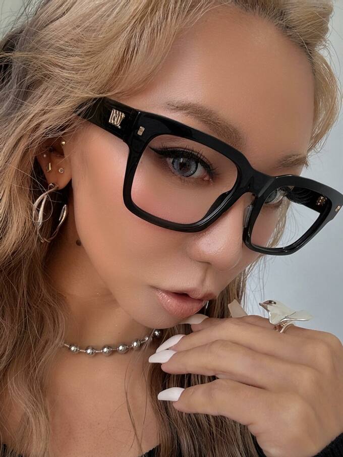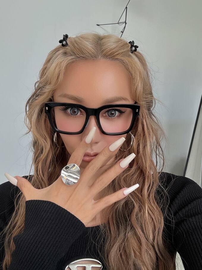 倖田來未さんは、、黒縁のメガネをかけて両手を広げ、白く長いネイルを見せています。指に輝くリングも印象的です。