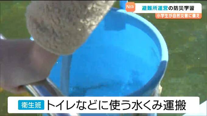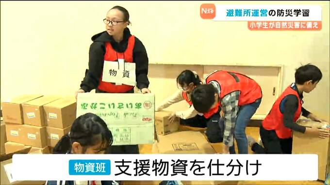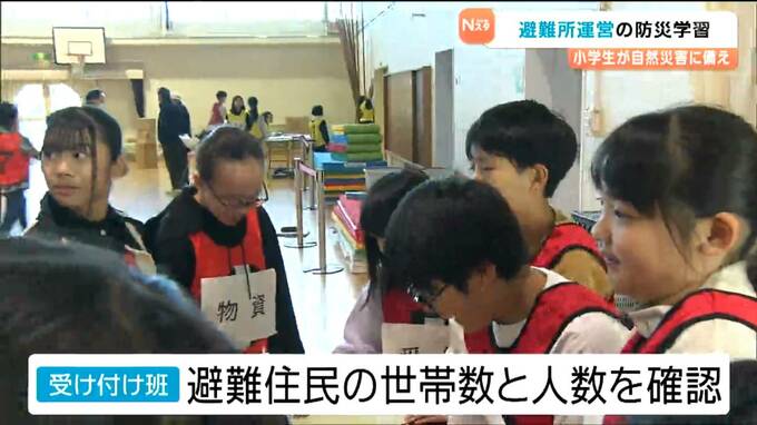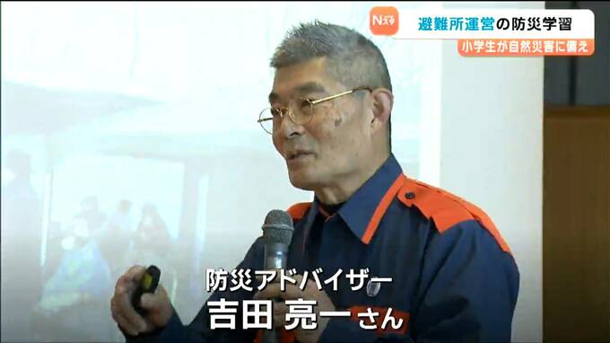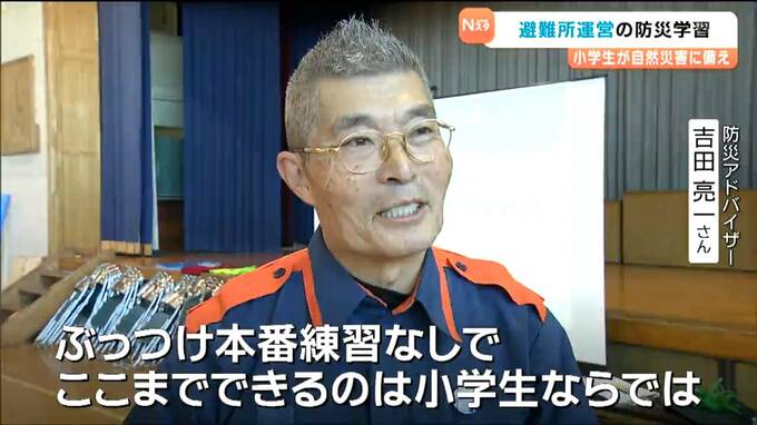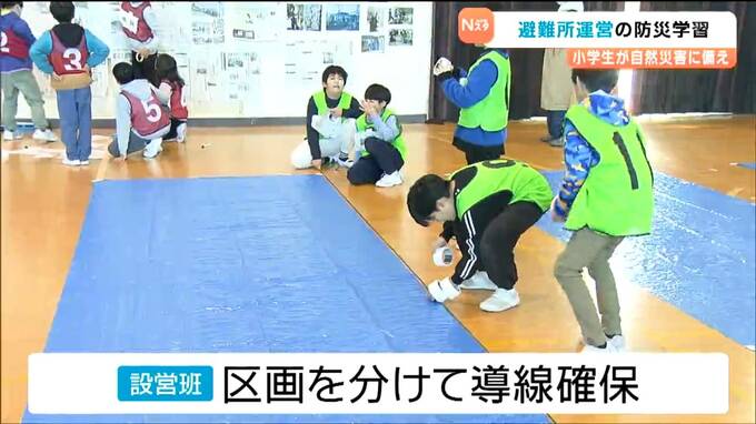 防災アドバイザーの吉田亮一さんが講師を務め、児童らは、設営班や炊き出し班、衛生班など7つの班に分かれて、東日本大震災の時に実際に行われた避難所運営を体験しました。