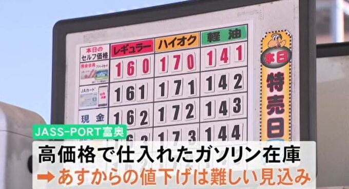 補助金の増額前に高い価格で仕入れたガソリンが残っているため、13日からすぐに値下げというわけにはいかないようです。