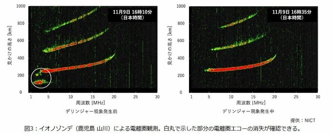 鹿児島の山川に設置された観測機器イオノゾンデでは、大規模な太陽フレアに伴うX線や紫外線の急増で、高度60~90 kmの電離圏D領域で、短波帯の電波が吸収されるデリンジャー現象が観測されました。