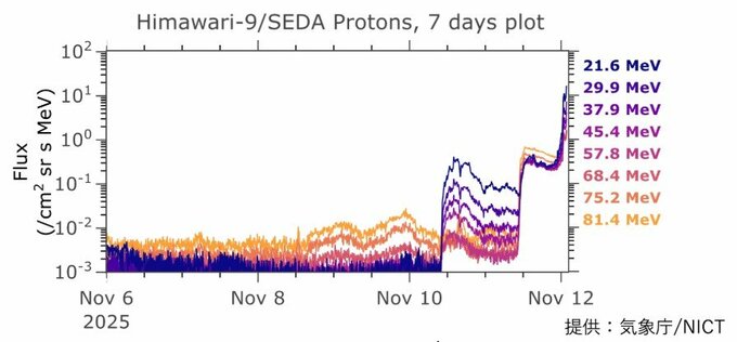 日本の気象衛星「ひまわり」でも、日本の経度上で高エネルギープロトン粒子が確認されました。