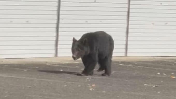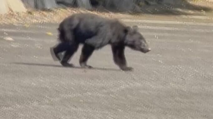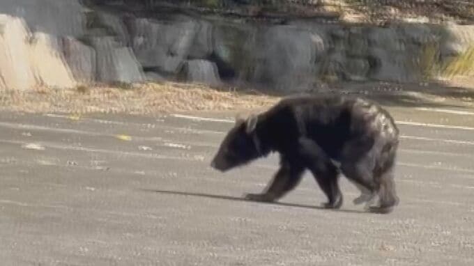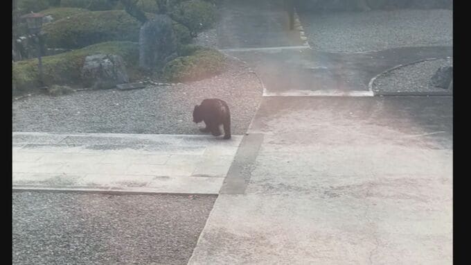 駐車場をゆっくり歩く体長1メートル50センチほどのクマ。11月7日の正午過ぎ、大野町にある来振寺の駐車場に一頭のクマが現れ、約2時間半にわたって境内に居座り、その後、寺の近くの山林に逃げたとみられます。