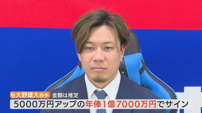 大野投手は12日、契約更改の交渉で、推定年俸5000万円アップの1億7000万円でサインしました。