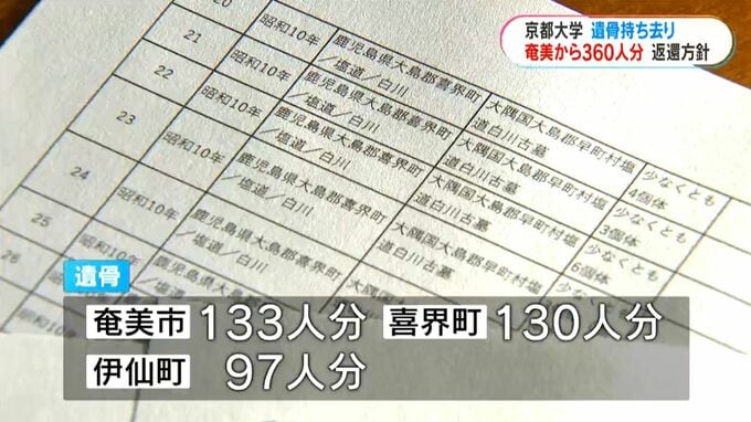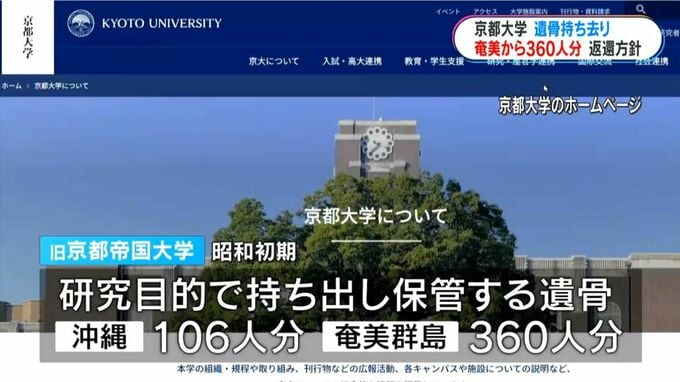 京都大学のホームページによりますと、旧京都帝国大学が、昭和初期に研究目的で持ち出し保管しているのは、沖縄から106人分、奄美群島から360人分の遺骨です。