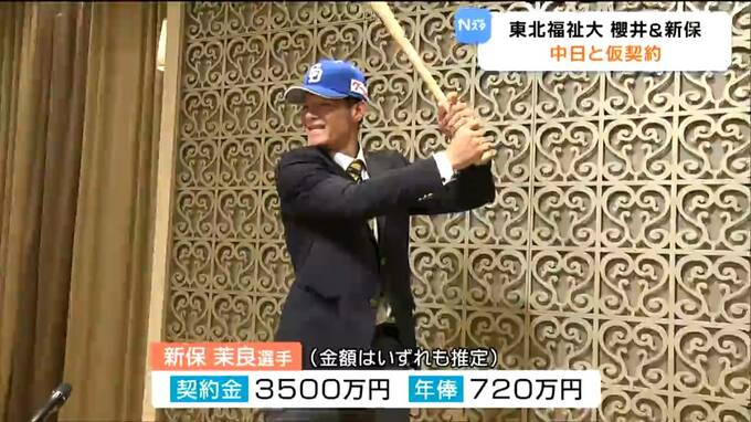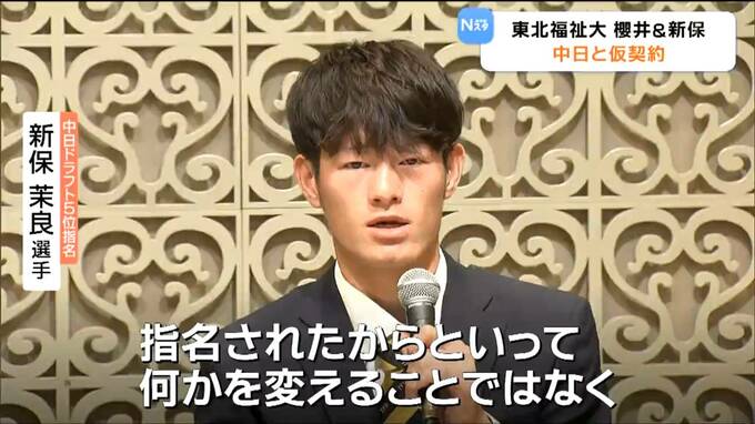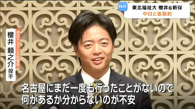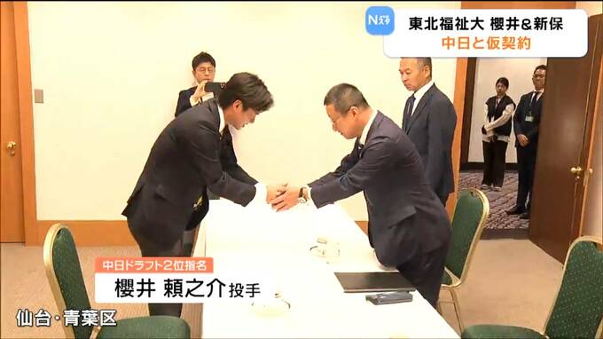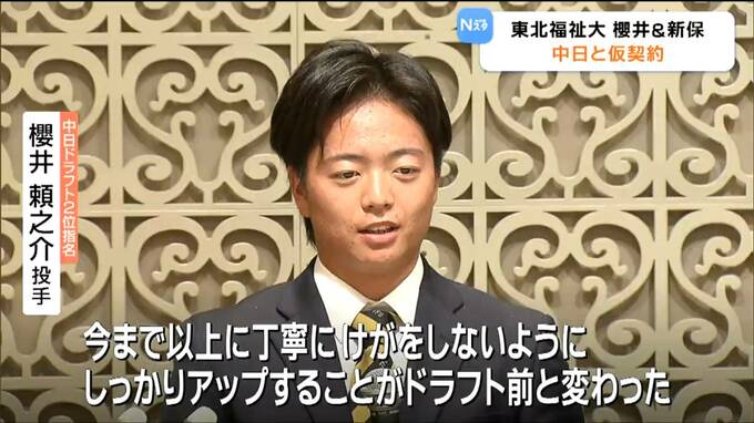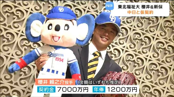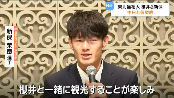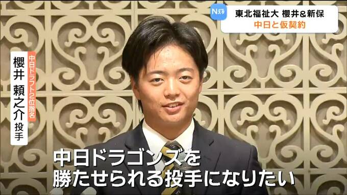プロ野球・中日ドラゴンズからドラフト指名を受けた東北福祉大学の櫻井頼之介投手と新保茉良選手が、12日に球団と仮契約を結びました。