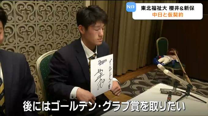 中日ドラゴンズから指名されたドラフト2位の櫻井頼之介投手、そして、5位の新保茉良選手が、仙台市内のホテルで、球団と仮契約を結びました。