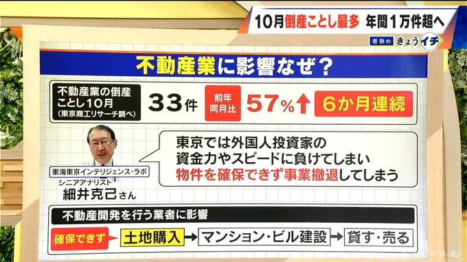 不動産業も厳しい状況になっていて、ことし10月で33件と数自体はそんなに多くはないですが、去年の同じ月と比べると57%倒産件数が増えていて、この流れが6か月連続となっています。このことについて細井さんに聞きますと「東京では外国人投資家の資金力やスピードに負けてしまい、物件を確保できず事業撤退してしまうケースがある」ということなんです。
