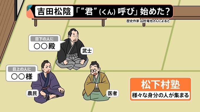 個性を重視する「松下村塾」としては、この身分制度を何とか崩したいということで、吉田松陰が言い出したのが「くん」です。