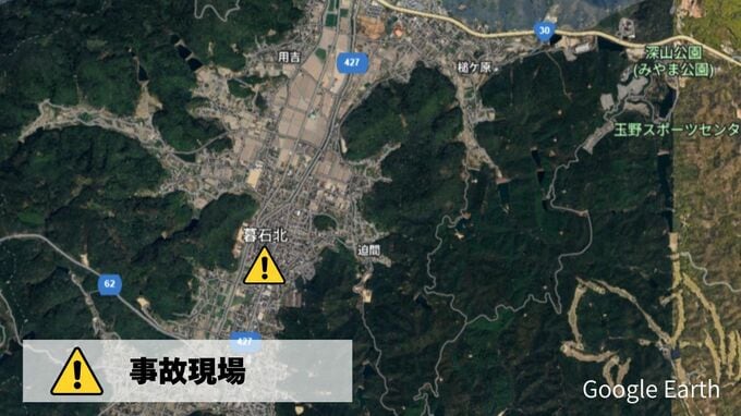 きょう午後7時20分ごろ、玉野市長尾の県道427号槌ケ原日比線で、「バスと車が事故をしている」という旨の通報が警察にありました(【画像①】は事故現場の地図)。
