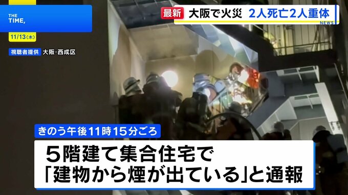 きのう夜、大阪市西成区の集合住宅で火災があり、2人が死亡、2人が意識不明の重体です。きのう午後11時15分ごろ、大阪市西成区の5階建て集合住宅で、「建物から煙が出ている」と消防に通報がありました。警察と消…