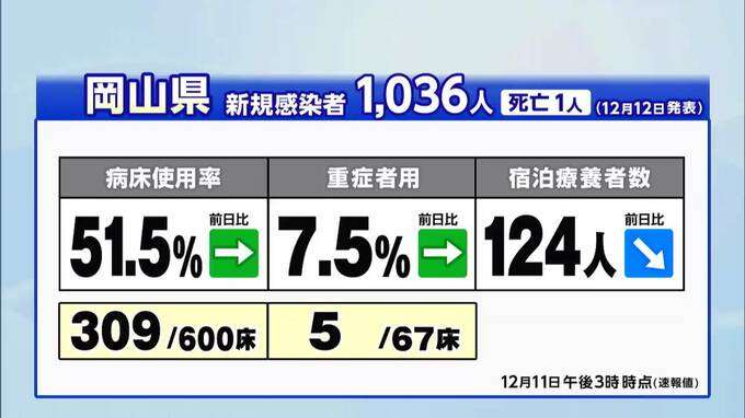 新型コロナウイルスの感染状況です。きょう(12日)、新たに岡山県で1036人、香川県で451人の感染が発表されました。岡山県では1036人の感染と、90代以上の女性の死亡が発表されました。高齢者施設や医療機関などで…