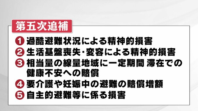 今回の審査会では「過酷避難状況での精神損害の賠償」、「要介護や妊娠中の避難の賠償増額」など5つの項目を見直し、中間指針の「第五次追補」という形で素案を示しました。