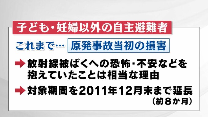 これまで、子ども・妊婦以外の自主避難者への賠償は、原発事故当初の時期の損害としていました。