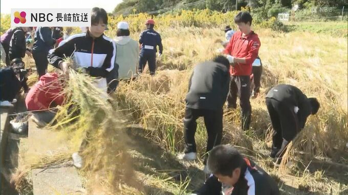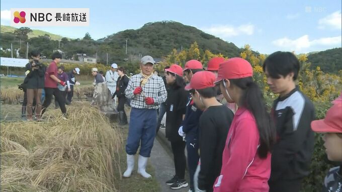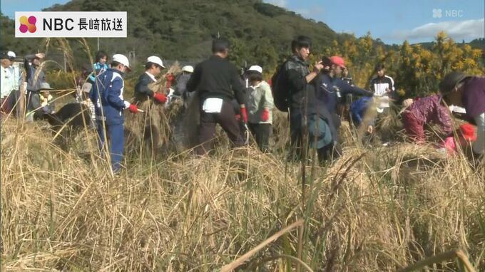 長崎兼対馬市でこのほど地元の子どもたちが古代米「赤米」の稲刈りに挑戦しました。