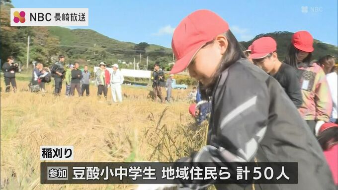 秋晴れのもと行われたこの日の稲刈りには地元の小中学生と地域住民合わせて50人が参加しました。