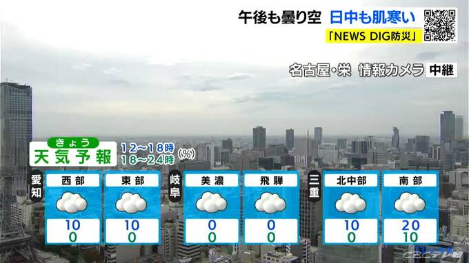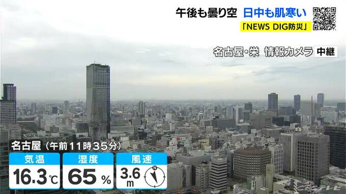 正午前の名古屋市内は、厚い雲が広がっています。けさはきのうのような冷え込みにはなりませんでしたが、日差しが届かず肌寒さは続いています。午後も曇り空が続くでしょう。