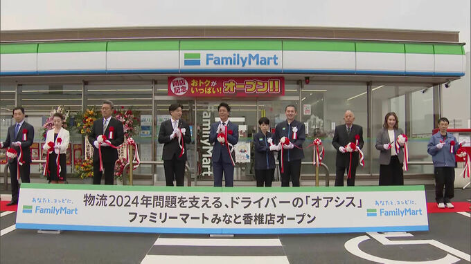 福岡市東区のコンテナターミナルの入り口に13日オープンした「ファミリーマートみなと香椎店」は、長距離ドライバーが自由に休憩できる店舗で7台分の大型車の駐車スペースを備えています。