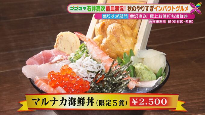 こちらの“インパクトグルメ”は、1日5食限定の「マルナカ海鮮丼」。岐阜米「ハツシモ」のご飯の上には、ブリやサワラ、クロムツなど、旬の鮮魚がなんと13種類も!