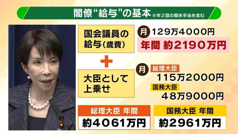 政府は11日、高市総理を含む閣僚の給与について、国会議員の歳費からの上乗せ分を当分の間、支給しないことを決めました。国会議員の歳費129万4000円に上乗せされる金額、「総理大臣115万2000円」、「閣僚48万9000円」をカットする=いわゆる“身を切る改革”です。