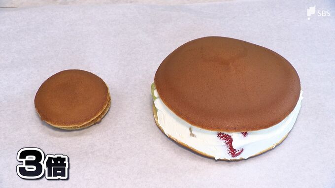 普通のどら焼きと比べると大きさは約3倍。4分の1にカットした際の断面がポイント。老舗ならではの“和の技”と、“洋の華やかさ”が融合した新感覚スイーツとして人気を集めています。