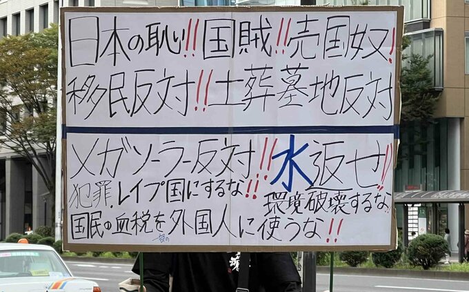 村井氏は街中で、通りすがりの若者に「売国奴」「土葬野郎」などと罵られたという。10月19日の日曜日には、こうした文言や村井氏への批判が書かれたプラカードを持った一団も現れたそうだ。