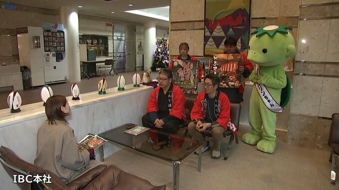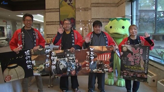 どぶろくを味わいながら遠野の冬の魅力を堪能できる「遠野どべっこ祭り」が22日から始まるのを前に、キャラバン隊がIBCを訪れイベントをPRしました。