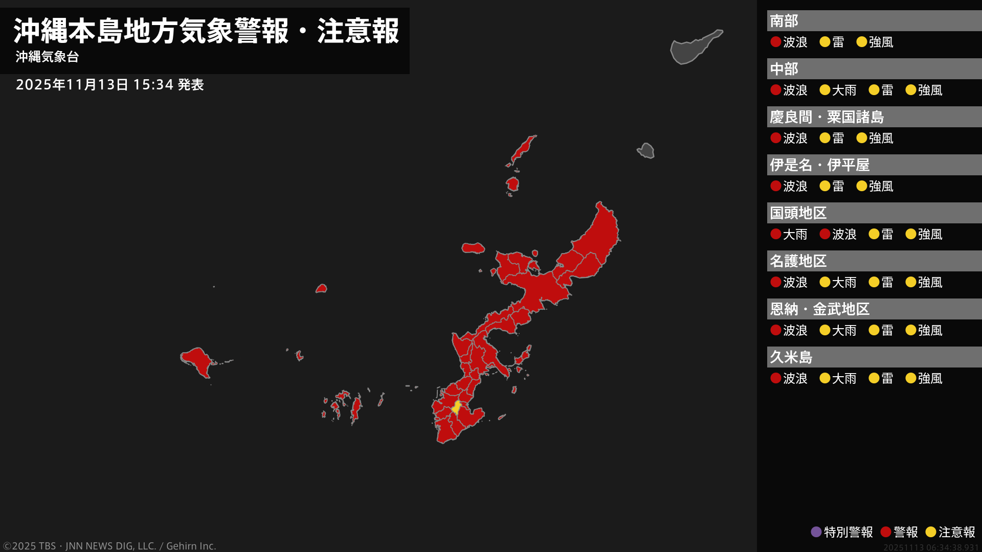 気象台は、午後3時34分に、波浪警報を那覇市、宜野湾市、浦添市、名護市、糸満市、沖縄市、豊見城市、うるま市、南城市、国頭村、大宜味村、東村、今帰仁村、本部町、恩納村、宜野座村、金武町、伊江村、読谷村、嘉手納町、北谷町、北中城村、中城村、西原町、与那原町、渡嘉敷村、座間味村、粟国村、渡名喜村、伊平屋村、伊是名村、久米島町、八重瀬町に発表しました。