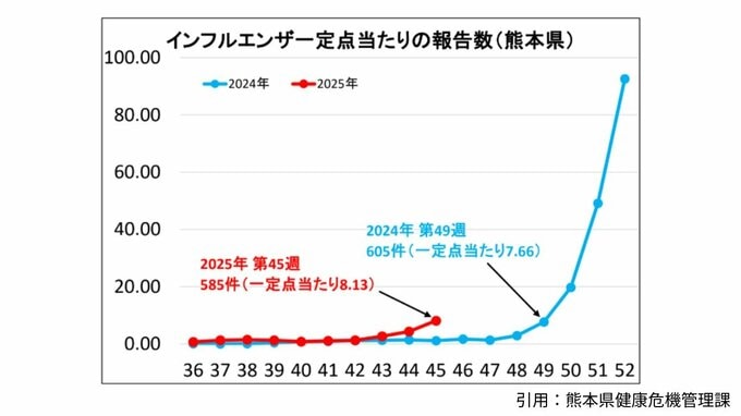 熊本県は、去年の報告数が605件(一定点あたり7.66)となった週から急激に報告数が増えていることを踏まえ、今年も同じ様に、流行の拡大に注意が必要としています。