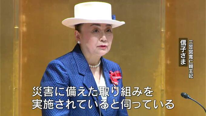 (三笠宮寬仁親王妃 信子さま)「我が国を襲う自然災害が、激甚化、頻発化する中、災害に備えた取り組みを実施されていると伺っている。最前線で人道的な活動を続けられるのは、皆さまのお力によるものと感謝申し上げます」