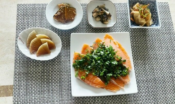 投稿された写真には、中央の白い正方形の皿に薄くスライスされたサーモンの刺身と山盛りの香草が美しく盛り付けられています。