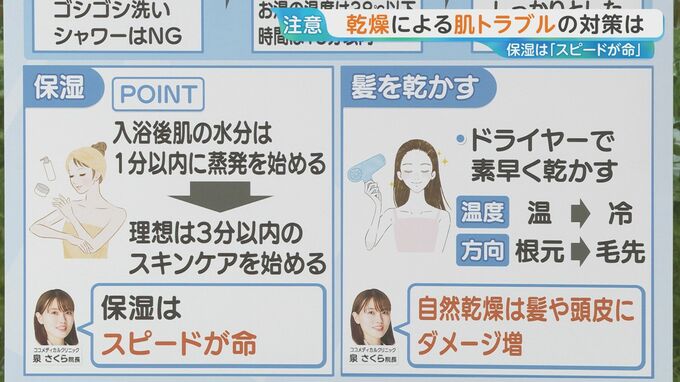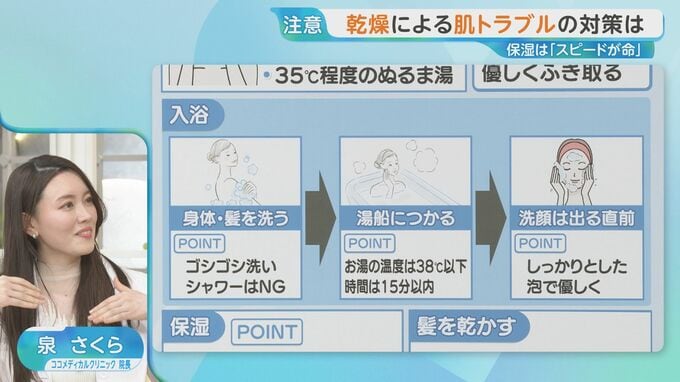 入浴後の肌の水分は1分以内に蒸発し始めるので、3分以内にスキンケアを始めることが理想です。